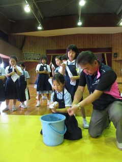 教えてもらったように雑巾を洗って絞ると、きれいになって大満足の子どもたち。早速、その日の掃除時間にも縦絞りを実践していました。