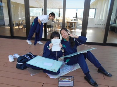 雲一つない青空の下、遠くに見える女神大橋と真っ青な海を描く人、黄やオレンジに色づいた山々と街並みを見下ろして描く人…。それぞれ、思い思いの風景を時間いっぱいに描き上げ、個性あふれる可愛らしい作品が完成しました。