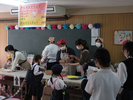 わくわくするような飾りで教室は大変身!ずらりと並ぶお店には、美味しそうな食事やグッズがいっぱい。射的やフリスビーなどなどのゲームもずらり…。バザー担当係のお父様、お母様方の出店にたくさんのお客さんが訪れ、校舎中が笑顔と活気でにぎわいました。