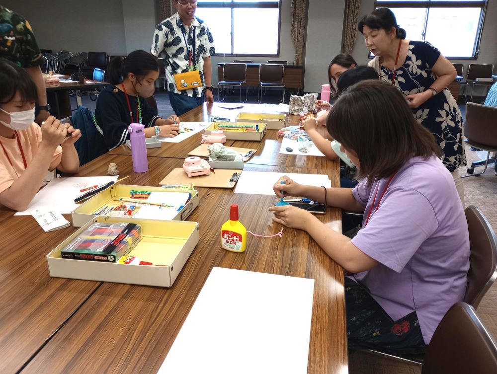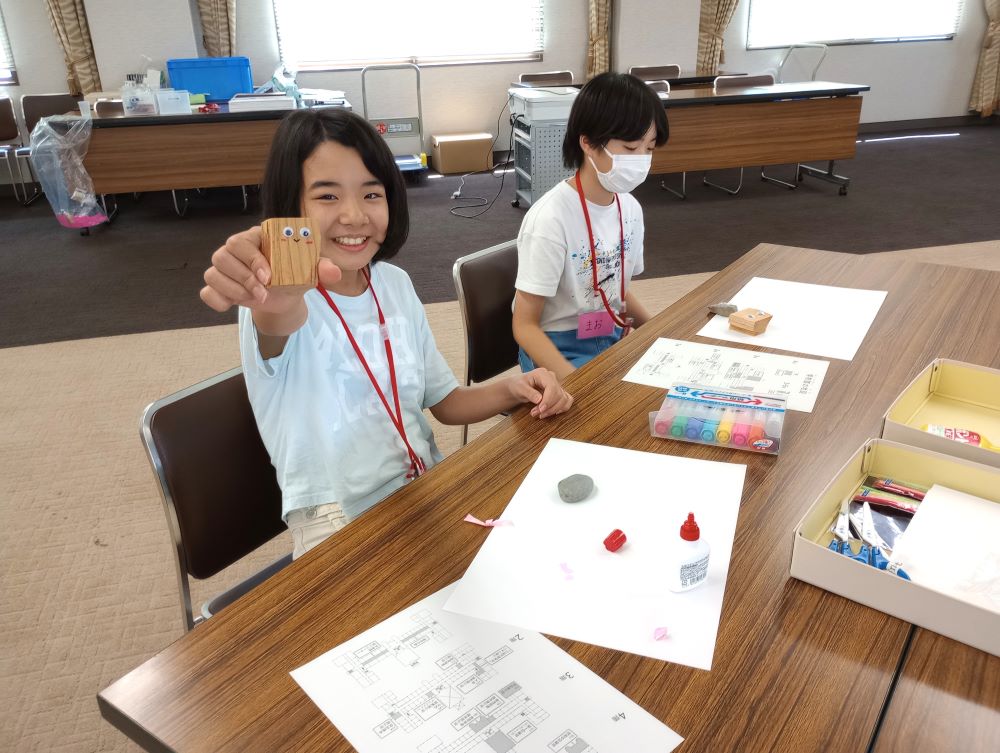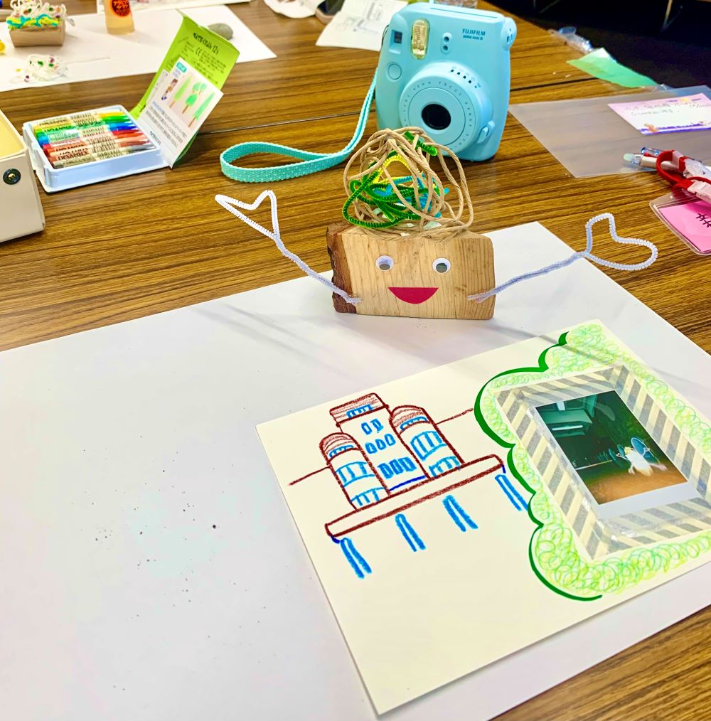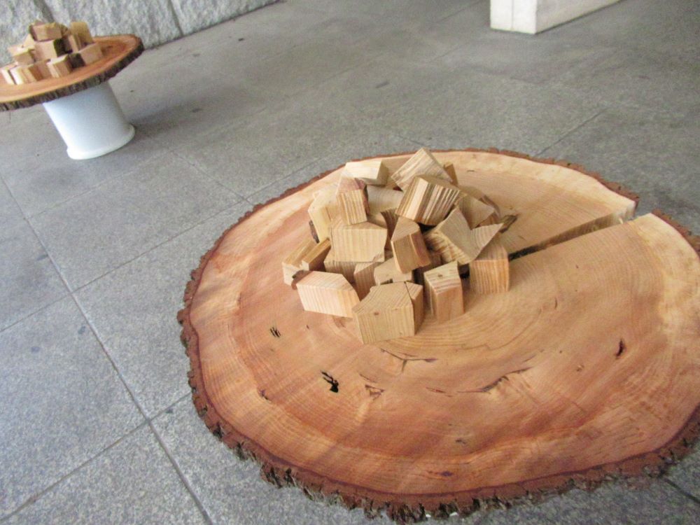 以前は他の大学施設もこの構内にありましたが、現在は博物館以外は全て新キャンパスに移転しました。私たちが行ったときも博物館周辺は道路の整備など工事中でした。博物館の入り口には100歳くらいのヒマラヤスギがあったのですが、この工事で伐採されました。伐採された大木は木片となり、私たちの手のひらに乗ってこのツアーで初めて館内に入ることができました。ワークショップはこの木片に飾り付けをして、その後一緒に館内で木片の記念撮影をするというものでした。木片は私たちの手によって、何か違うものに変わったような気がします。館内を楽しんでくれたかな。