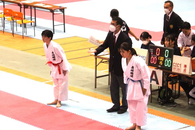 続く「個人形」では、圧巻の形を披露してくれました。拍手のみの応援となった会場では、選手達の気迫に満ちた声や手刀が空を切る音、息遣いや緊張感がダイレクトに伝わってきました。予選では2グループに割り振られ、3年生は見事に通過を果たしました。喜びも束の間、何と3位決定戦で長崎精道中の二人が直接対戦することが確定。今まで稽古を共にし、県大会を目指して切磋琢磨してきた仲間同士での対戦となり、本人同士はもちろん、応援している関係者も複雑な思いで3位決定戦を観戦しました。