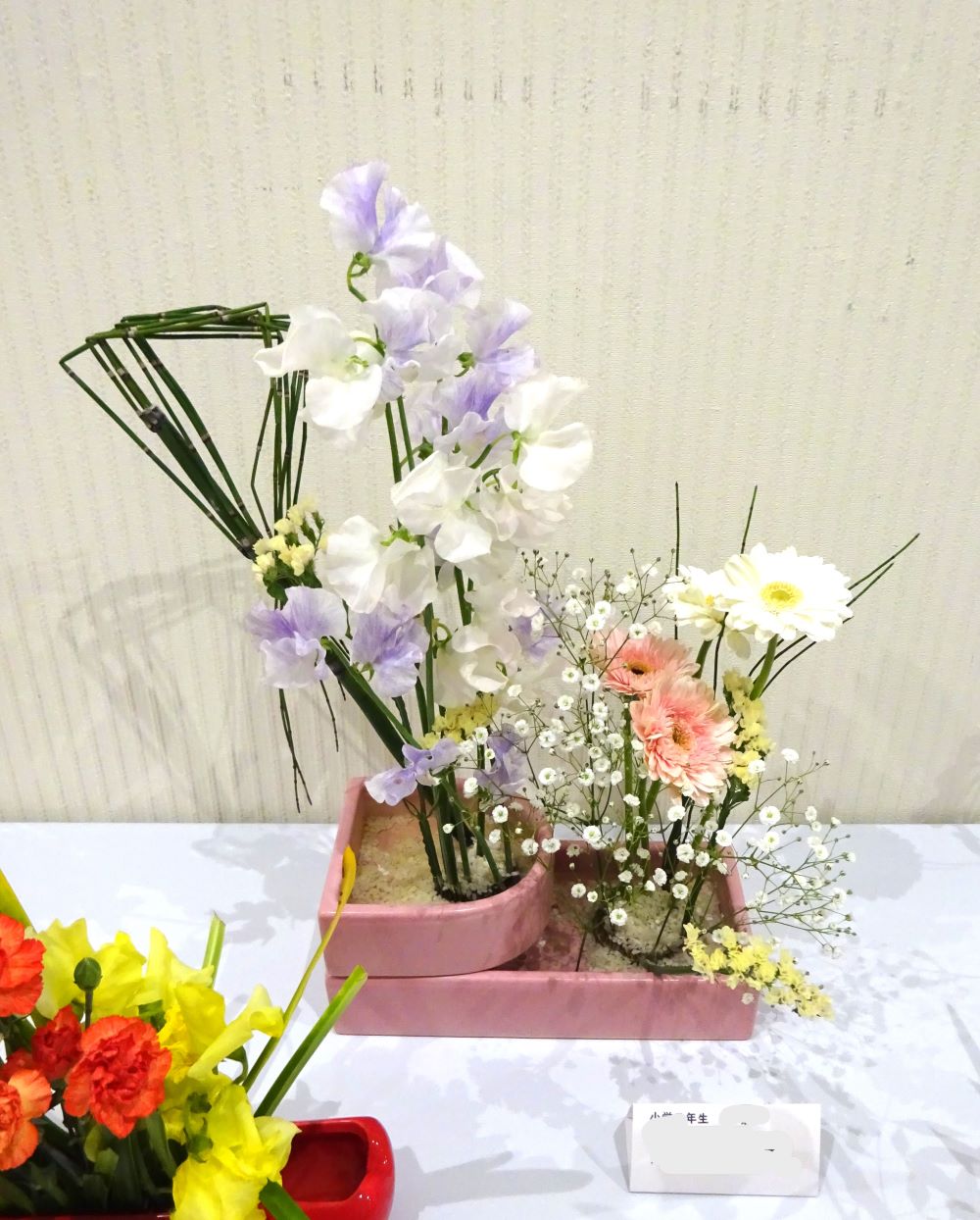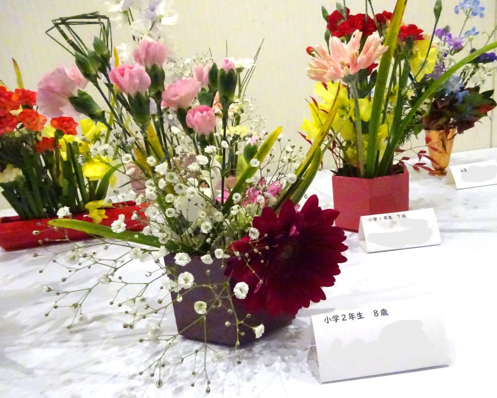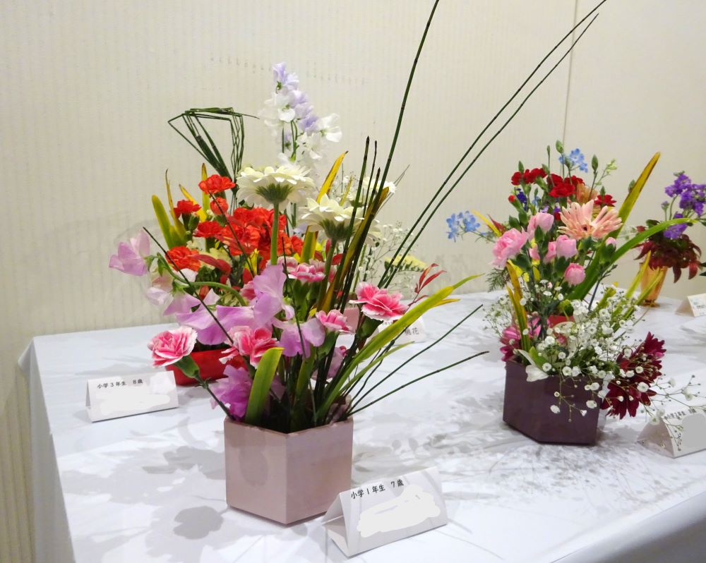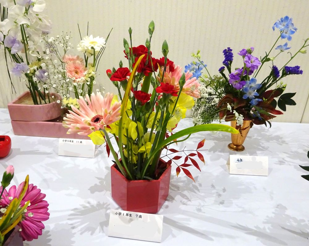 長崎市内のいけばなの流派の方々の素敵な作品が並ぶ中、子供たちの体験いけばなの可愛らしい花も飾られ、来展者の目を和やかに楽しませてくれていました。
