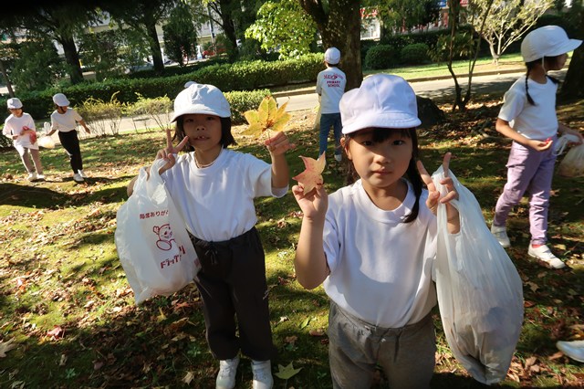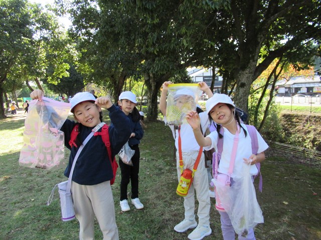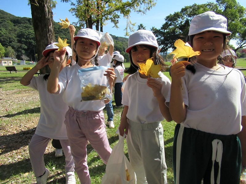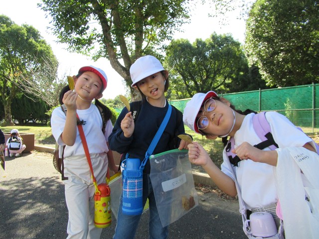 諫早運動公園に着くと、まずは、落ち葉やどんぐりを拾いました。例年より、木々が色付くのが遅いようですが、しっかり秋を感じることができました。