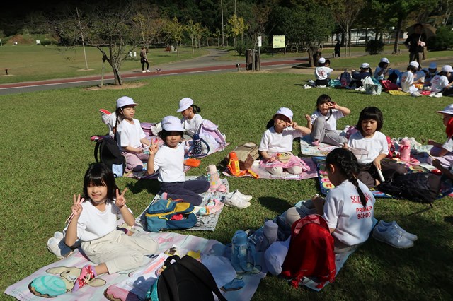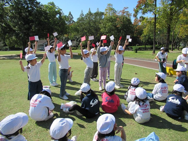 その後、広い芝生のグラウンドで2年生主催のレクリエーション。みんなで楽しいひと時を仲良く過ごしました。宝探しや伝言ゲームなど、わいわいと盛り上がりました!手作りのがんばり賞もたくさん準備してくれていました。2年生のお姉さんたち、ありがとう!